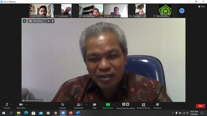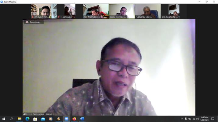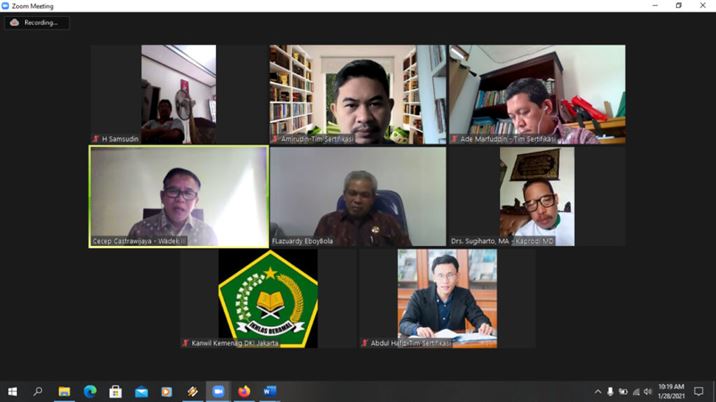 Jakarta, 28/1/2021. Fakultas Dakwah dan Ilmu Komunikasi UIN Syarif Hidayatullah Jakarta menyelenggarakan rapat kordinasi dengan Kepala Bidang Penyelenggaraan haji dan Umrah Kemenag DKI Jakarta. Rapat kordinasi membicarakan tentang pelaksanaan sertifikasi pembimbing haji dan umrah profesional yang telah diselenggarakan seperti kerjasama dengan Forum Komunikasi Kelompok Bimbingan Ibadah Haji dan Umrah Wilayah DKI Jakarta yaitu tanggal 10 sampai dengan 18 Desember 2020 maupun kerjasama dengan Jaringan Alumni Timur Tengah Indonesia (JATTI) wilayah Jakarta Raya taanggal 12 sd 20 Januari 2021. Rapat yang dilaksanakan menggunakan Zoom tersebut dihadiri oleh wakil dekan bidang kemahasiswaan, alumni dan kerjasama Fakultas Dakwah dan Ilmu Komunikasi UIN Syarif Hidayatullah Jakarta, Cecep Castrawijaya, Sugiharto Kaprodi Manajemen Dakwah bererta Sekprodi, Amirudin juga Ade Marpudin serta H. Tabroni, Kabid PHU Kemenag DKI Jakarta beserta H. Syamsudin Kasi PHU membahas rencana kegiatan sertifikasi yang akan disenggarakan kerjasama dengan AMPUH dan HIMPUH di bulan Februari 2021 yang akan datang.