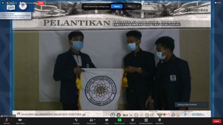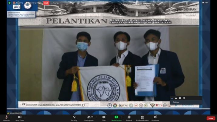 FDIKOM Jakarta. Fakultas Dakwah dan Ilmu Komunikasi UIN Syarif Hidayatullah Jakarta gelar pelantikan Dewan Mahasiswa (DEMA), Senat Mahasiswa (SEMA) dan HMPS tahun 2021. Kegiatan ini berlangsung via daring melalui aplikasi Zoom dan sebagian ofline, Selasa (2/02/2021) pada pukul 14 sd 17.00 WIB. Acara dihadiri oleh Para Wakil dekan, para Kaprodi, Sekprodi serta mahasiswa yang menjadi pengurus baru dan sebagian pengurus lama.