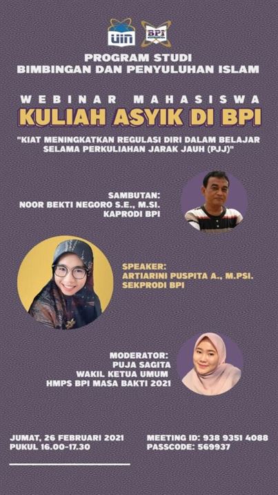Jum’at, 26 Februari 2021, pukul 16.00 hingga 18.00 WIB, Program Studi Bimbingan dan Penyuluhan Islam mengadakan Webinar Mahasiswa “Kuliah Asyik di BPI” yang bertemakan “Kiat meningkatkan Regulasi Diri dalam Belajar Selama Perkuliahan Jarak Jauh (PJJ)” Tema tersebut disampaikan oleh Master of Ceremony (MC) pada acara kali ini yaitu Salsa Nabila Rahmawati, mahasiswa BPI 2019.
