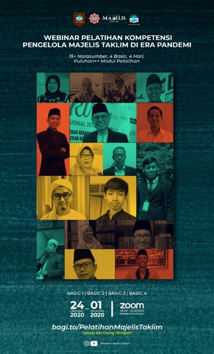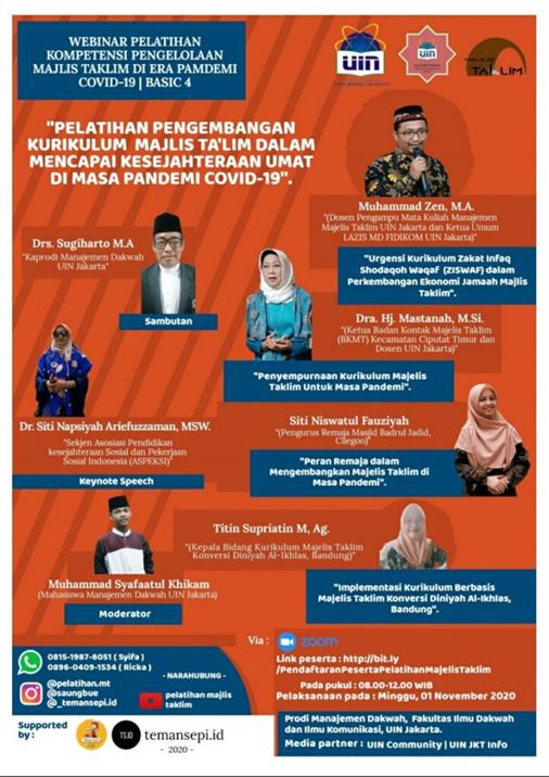 Program studi Manajemen Dakwah Fakultas Ilmu Dakwah dan Ilmu Komunikasi (FIDIKOM) telah melaksanakan webinar pelatihan majelis taklim seri ke-4, dengan mengusung tema “Pelatihan Pengembangan Kurikulum Majelis Taklim dalam Mencapai Kesejahteraan Umat di Masa Pandemi” pada hari Minggu, 01 November 2020 pukul 08.30-12.00 WIB yang dilaksanakan melalui aplikasi Zoom Meeting dan juga live streaming di Youtube.