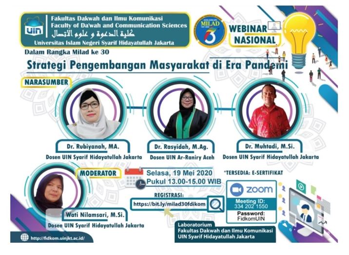 Selasa, (19/05/20) dalam rangka milad Fakultas Ilmu Dakwah dan Ilmu Komunikasi UIN Syarif Hidayatullah Jakarta ke-30, program studi Pengembangan Masyarakat Islam (PMI) mengadakan webinar nasional dengan tema “Strategi Pengembangan Masyarakat di Era Pandemi” yang dilaksanakan pada pukul 13.00 sampai dengan pukul 15.00 WIB.